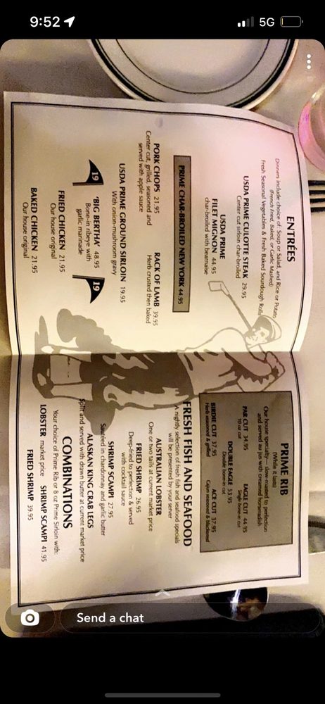 “ Well it started out a little rough. I opened my menu and a black bug came flying out of it. Ran across table and my husband killed it. We were really unsure if we'd stay to find out if food was good or bad after that. But with the mixed reviews we almost left. Glad we didn't leave because the prime rib was one of the BEST we've ever had. Omg!!! The flavor was amazing, perfectly cooked, take advice from others if you order it medium, you'll get medium rare, so order accordingly. The veggies were also nicely cooked with nice crunch still do veggies. Baked potato was great, they give you plenty of butter, sour cream and green onions to load on your potatoes yourself. I have to say the celery, carrots and pepperoncini with ranch is interesting addition to bread basket. Clam chowder was good too, could have been hotter though. Service was great, I'm not sure if others were talking about same waiter we had, an older blonde lady, but she was super sweet and attentive. It is very dark in there so if you're going for some romance you got it. But can be loud at bar depending on guests that are hanging out. It's a small area so if someone is talking loud you will hear it. Overall good experience would definitely go back for the prime rib. Oh and drinks are strong, they are doubles so fair warning. Cheers! ”