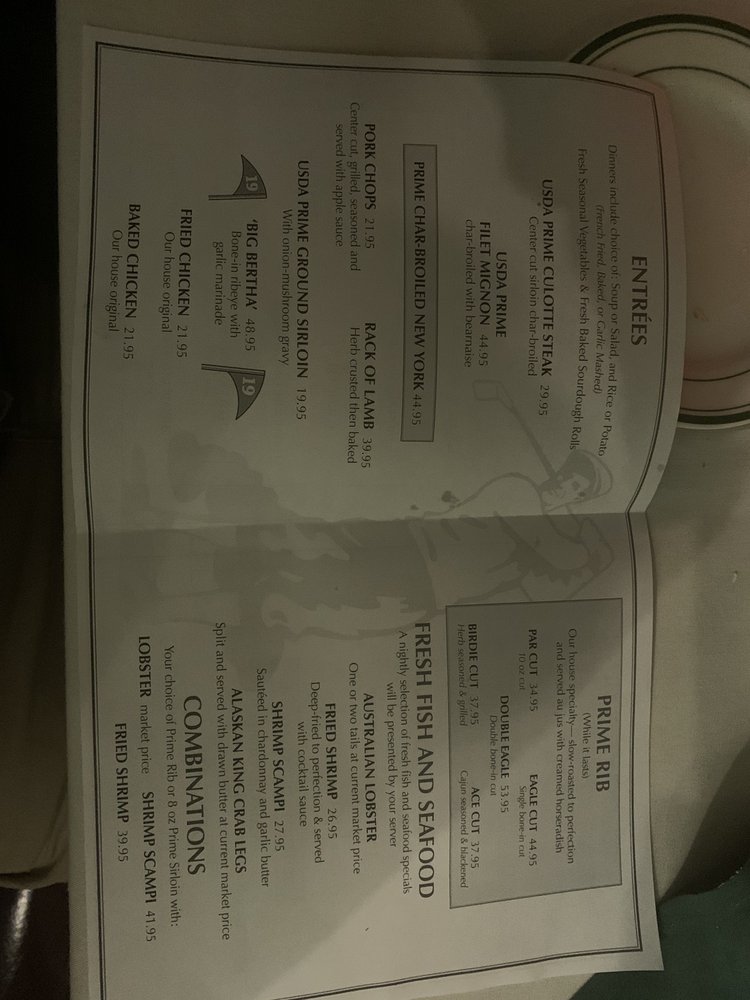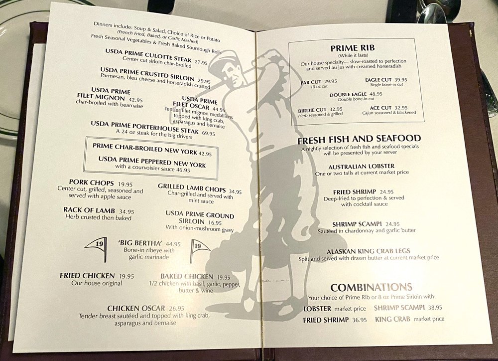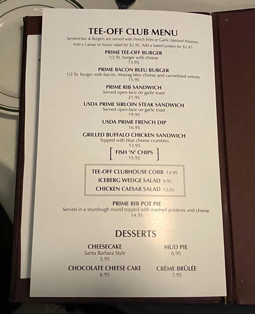 Tee-Off Restaurant and Lounge is a classic steakhouse and cocktail bar located in Santa Barbara, CA. The menu features a variety of options, including a flavorful Prime Rib selection, delicious Baked Chicken, juicy Lamb Chops, and more. Customer reviews mention the exceptional service and great martini offerings. The retro vibe of the restaurant adds to its charm, with classic cocktails available at a reasonable price. The Prime Rib, in particular, receives high praise for its amazing flavor and perfect cooking. The ambiance is described as romantic but can get loud at the bar area. Overall, Tee-Off Restaurant and Lounge is a well-kept local secret worth visiting for a delightful dining experience.